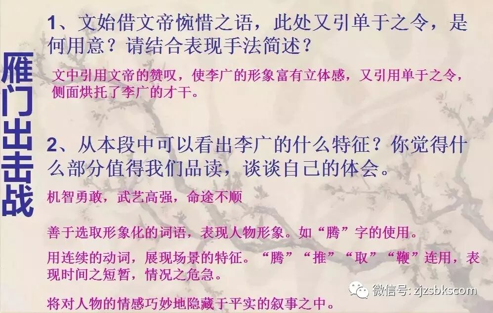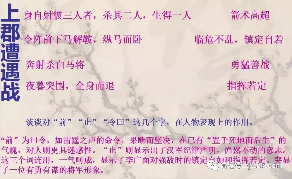 剪裁詳略得當(dāng)。作者選取了四場典型戰(zhàn)役(上郡遭遇戰(zhàn)、雁門出擊戰(zhàn)、右北平以四千對四萬敵之戰(zhàn)、最后隨衛(wèi)青出擊一戰(zhàn))來刻畫李廣形象的主要方面,用細(xì)節(jié)描寫、對比手法,比較完整全面地刻畫了李廣形象的不同側(cè)面,使李廣形象鮮明具體,真實可信。
